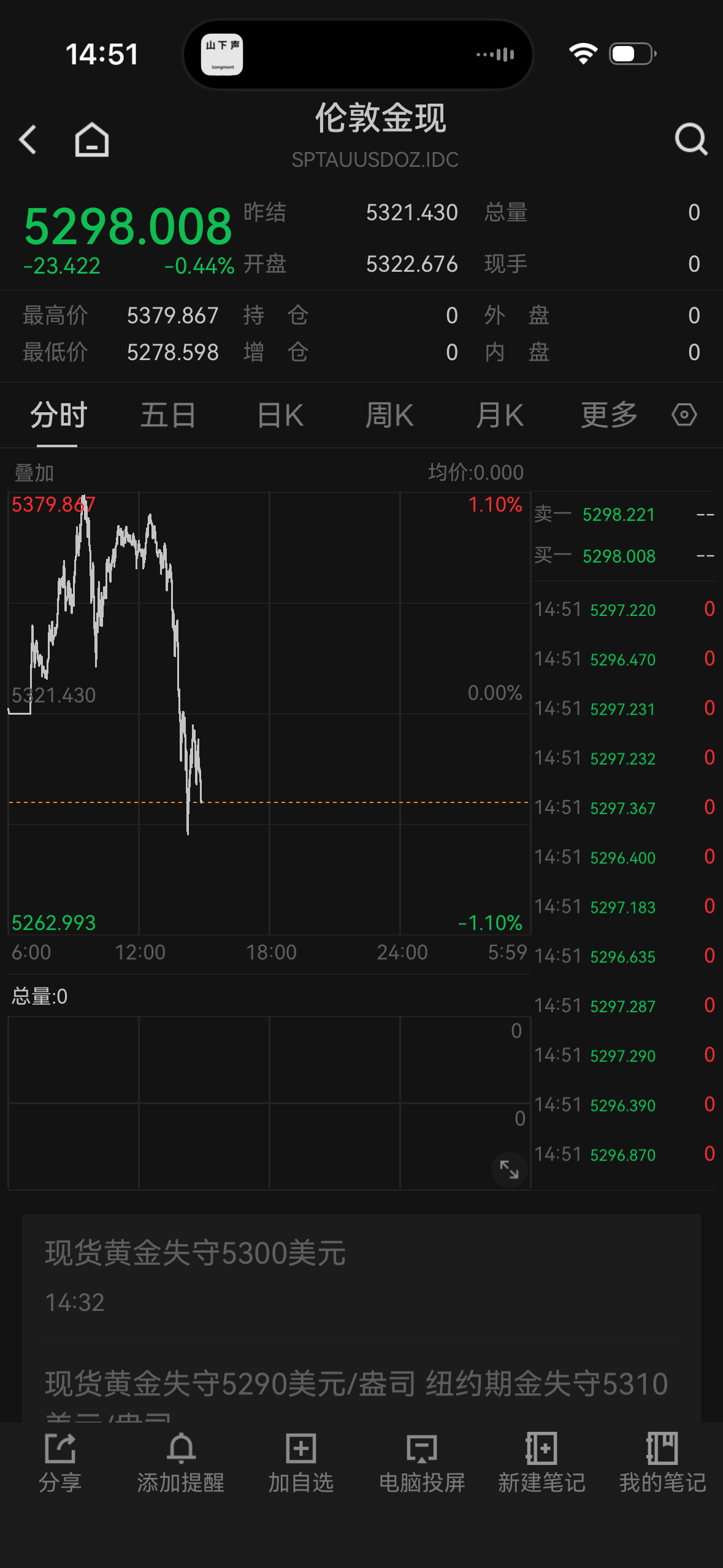 截至发稿时,现货黄金跌破5300美元/盎司,交投于5298美元/盎司附近,日内跌0.44%。