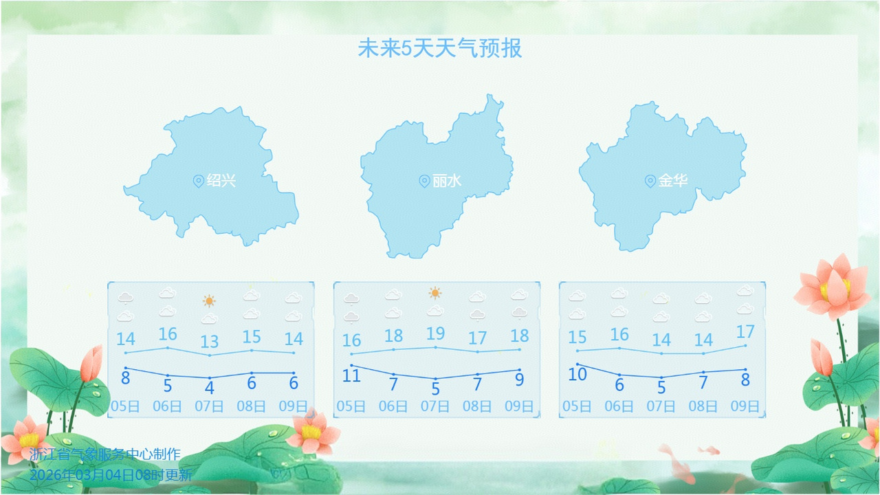 降温方面,因为本轮冷空气总体较弱,其中浙北地区降幅较明显,降温后最高气温会降至15℃,最低气温则会跌至5℃以下,“阴冷”感加重。