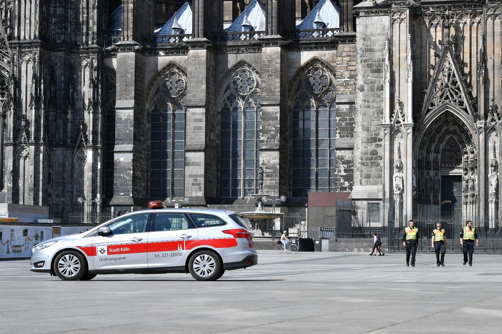 2020年4月16日,在德国科隆,安保人员在科隆大教堂前的广场上执勤。新华社发(乌尔里希·胡夫纳格尔摄)
