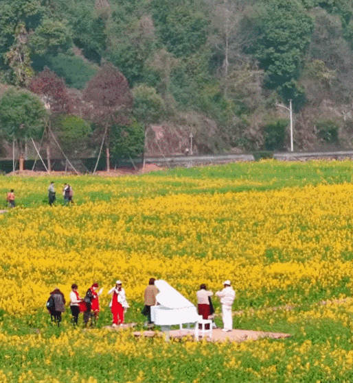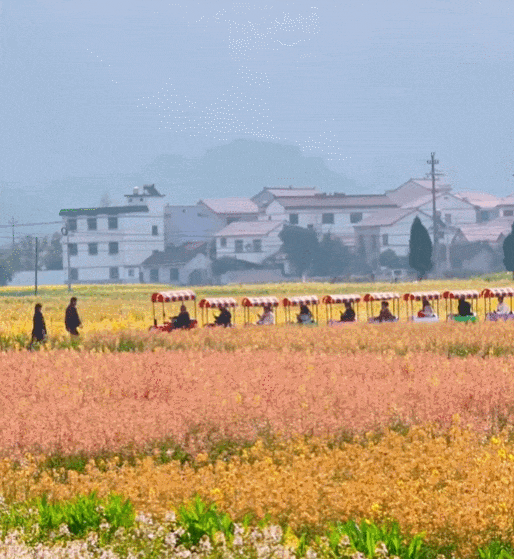 淡粉、橘黄、乳白……武义县大田乡白衣坑村茶塘畈500亩的油菜花拥有七彩颜色,乘着田园小火车穿梭,在白色钢琴边打卡,每一刻都像是美好假日。