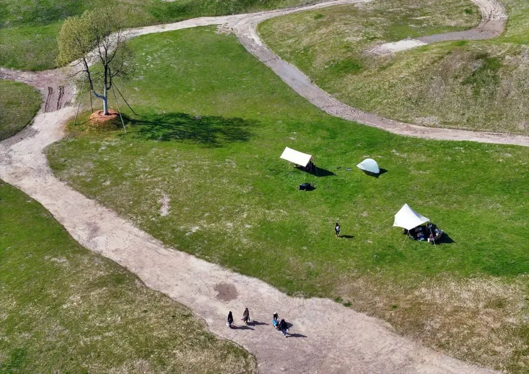 从高处俯瞰东阳金店的大草坪,弯曲的小路将之切割成深浅不一的大地格子,一只只风筝点缀其上,覆上一层童话般的浪漫。