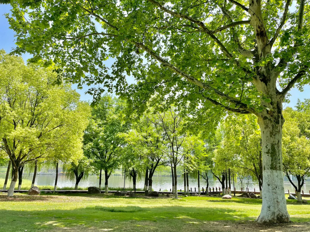 义乌莲塘公园有许多大块草坪,湖面澄澈,倒映着岸边草木,如诗如画,是野餐、放空的好去处。