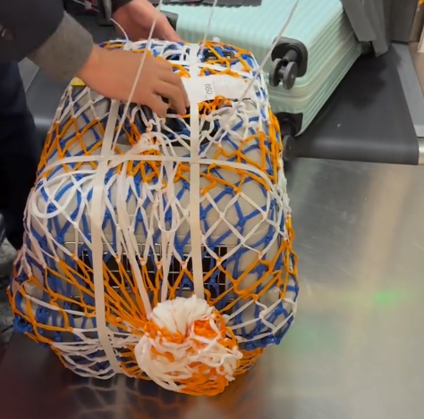 王女士告诉记者,1月27日,她带着爱犬乘坐东航航班从杭州萧山国际机场前往西双版纳嘎洒国际机场。在值机柜台前的特殊行李打包区,她目睹了工作人员极其谨慎的操作流程:地勤人员首先对航空箱进行了全面检查,确认锁扣牢固后,用行李托运专用绳索在箱体的横纵方向上各捆扎了两道,形成一个稳固的“井”字。为了防止运输途中颠簸导致箱门意外弹开,工作人员还特意加了几根塑料绳索进行二次加固。