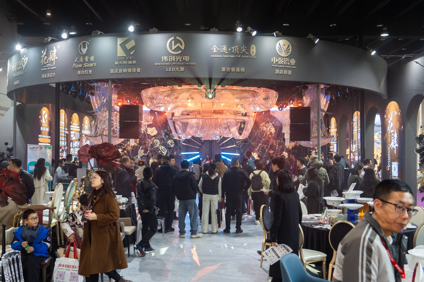 打出“中国首家高端宴会生态圈供应链平台”的广州迪斐婚恋联盟直接在展会现场打造了一场“婚宴”,联合灯光、音响、花艺、水晶、酒店用瓷、餐桌椅等婚宴用品相关企业组团参展。“我们都是精选各行业的头部企业,像酒桌上摆放的这些餐碗,都是做了30多年的老牌名企。目前平台已聚合了几十家供应链企业,可以为宾馆酒店提供一站式的宴会服务。”该联盟发起人冯红松表示,目前已与全国2000+家酒店达成合作,“我们是第4年来义乌参展,相比单一的产品展陈,这种场景式的解决方案能给客户更好的体验感,前几年来效果都不错,有时忙得中饭都没时间吃。”