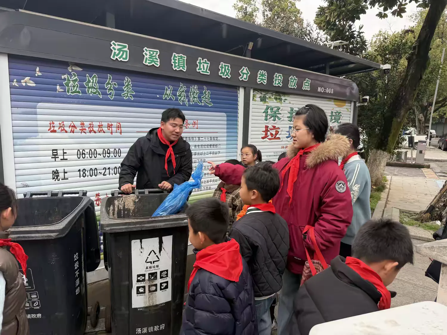 在社区垃圾分类投放点,志愿者带领孩子们开展实地教学。从识别垃圾桶标识、分辨垃圾种类,到亲手将垃圾投入对应容器,孩子们认真观察、积极实践,在操作中巩固分类知识,用实际行动践行志愿精神,守护社区环境整洁。