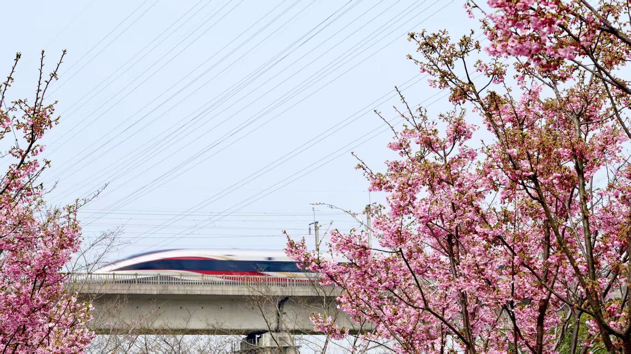 上午,G7581次列车穿行在高铁线上,串联起田野阡陌、城乡沃野,在车轮与花香交织中,持续释放“赏花经济”芬芳。
