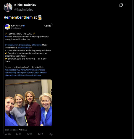 他还张贴了一张欧盟委员会主席冯德莱恩和欧盟外交与安全政策高级代表卡拉斯等人“同框”照片。“在加油站时,要记得这些人。”他写道。