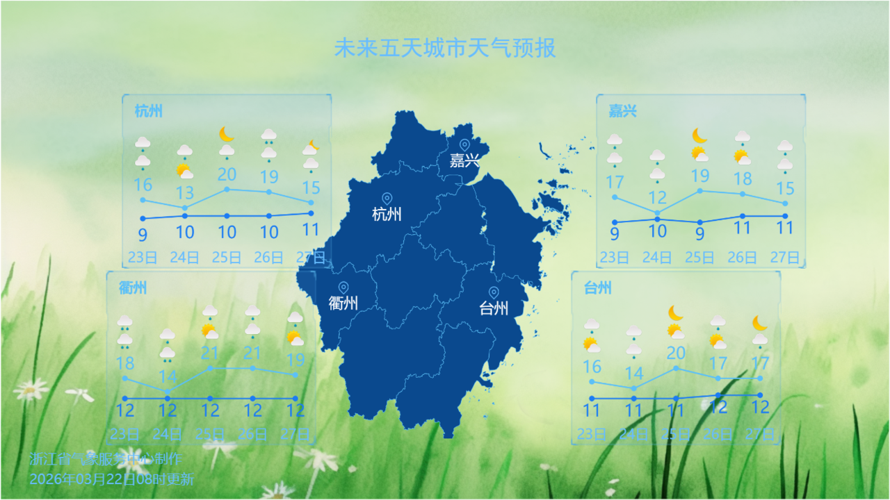 不过,由于有弱冷空气活动,再加上下雨,最高气温起伏比较大,特别是明天,浙北地区最高气温仅12~13℃,浙中地区14~15℃。