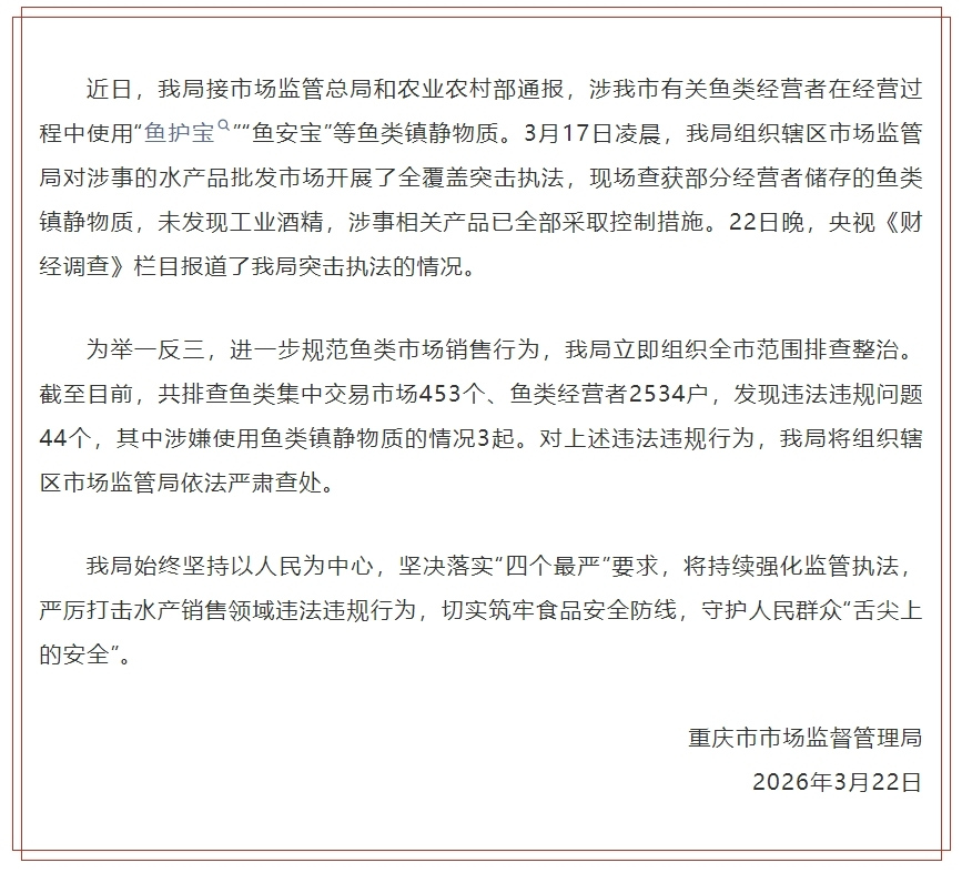 3月22日晚,重庆市市场监督管理局发布情况通报,近日,该局接市场监管总局和农业农村部通报,涉重庆市有关鱼类经营者在经营过程中使用“鱼护宝”“鱼安宝”等鱼类镇静物质。3月17日凌晨,该局组织辖区市场监管局对涉事的水产品批发市场开展了全覆盖突击执法,现场查获部分经营者储存的鱼类镇静物质,未发现工业酒精,涉事相关产品已全部采取控制措施。22日晚,央视《财经调查》栏目报道了该局突击执法的情况。