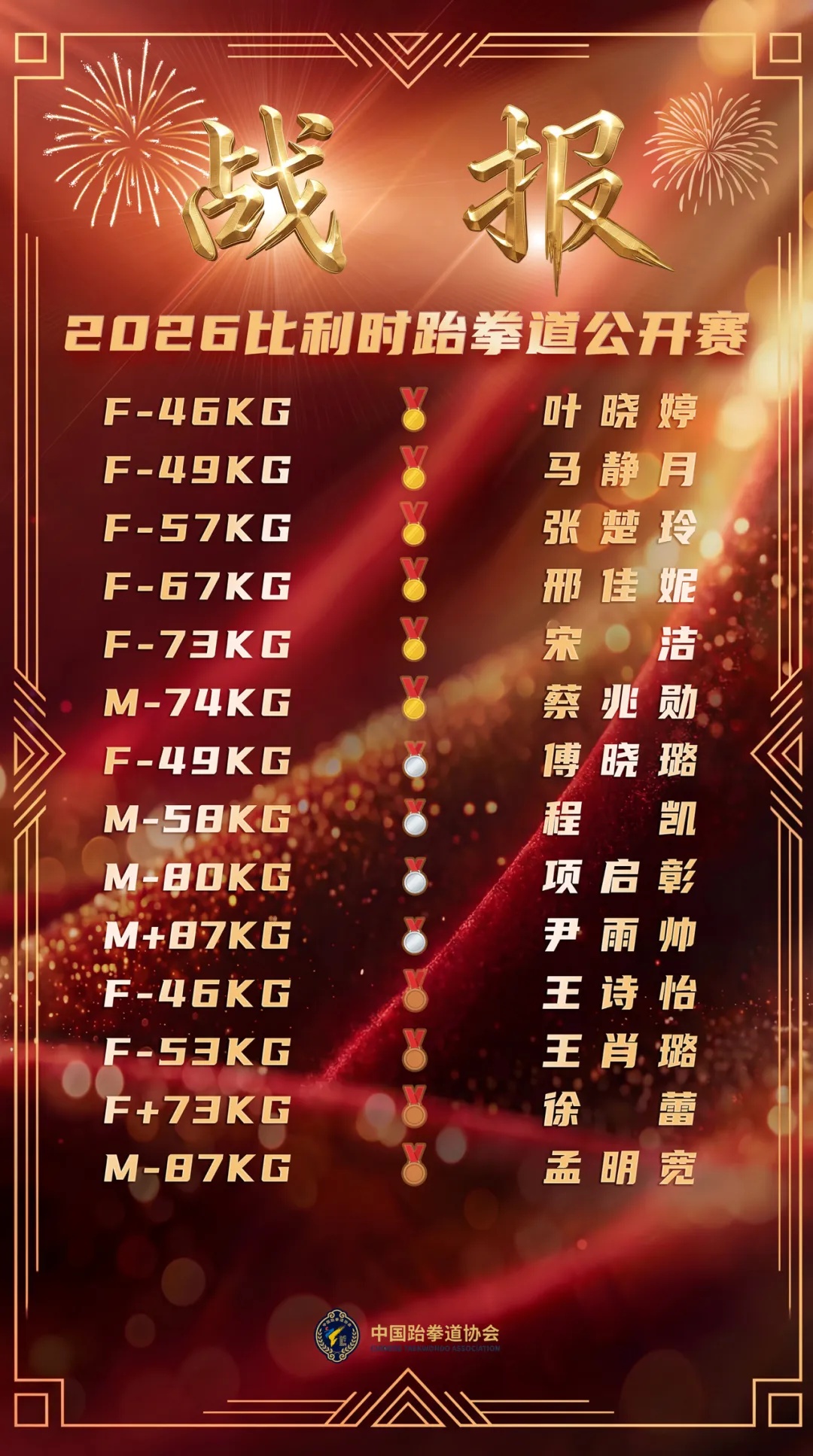 当地时间3月22日,2026年比利时跆拳道公开赛在比利时洛默尔落下帷幕。共有76个国家(地区)的562名运动员参加了本届赛事,中国跆拳道队26名队员出战全部16个级别,取得6金4银4铜的成绩。