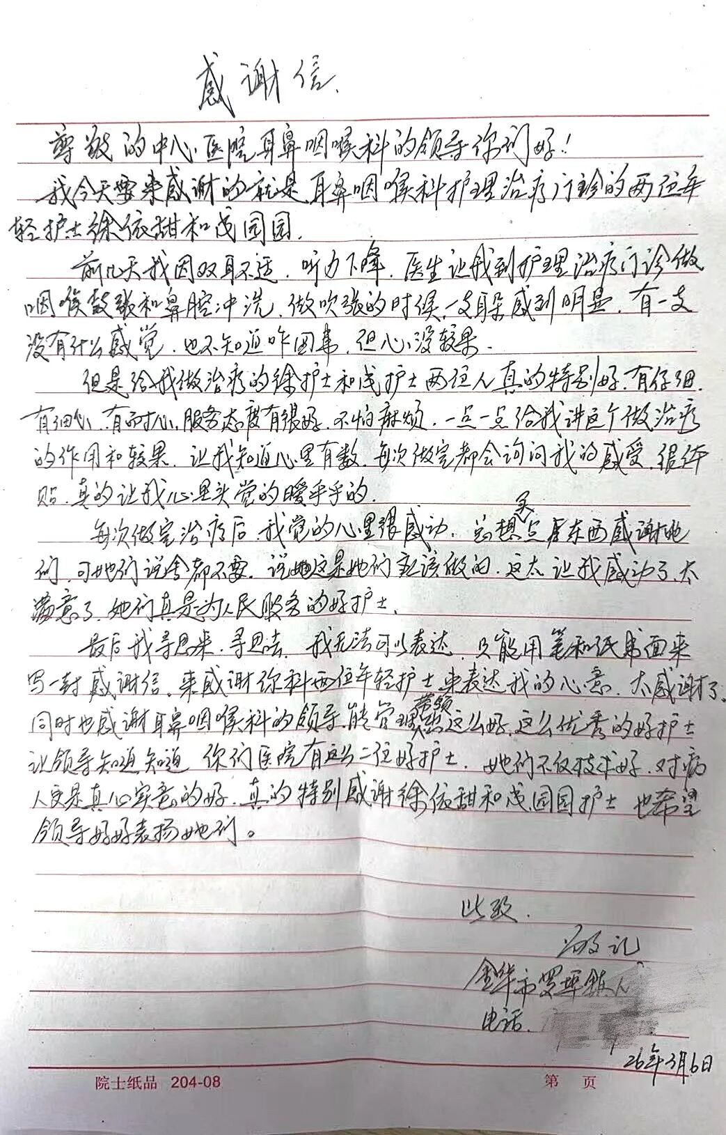 “初诊时,我心里很忐忑,耳朵听不见,又怕治不好。”在耳鼻咽喉科头颈外科护理治疗门诊,汪大伯回忆起初次就诊时的焦虑。这份不安,很快被徐护士和成护士的耐心化解。在感谢信中,汪大伯写道:“她们人特别好,细心耐心,不怕麻烦。每次做治疗都给我讲解作用,做完都要问我的感受。”对于汪大伯而言,两位护士的专业操作是治身,而那份用通俗语言讲解原理、用一次次询问抚平焦虑的温柔,则是抚心。