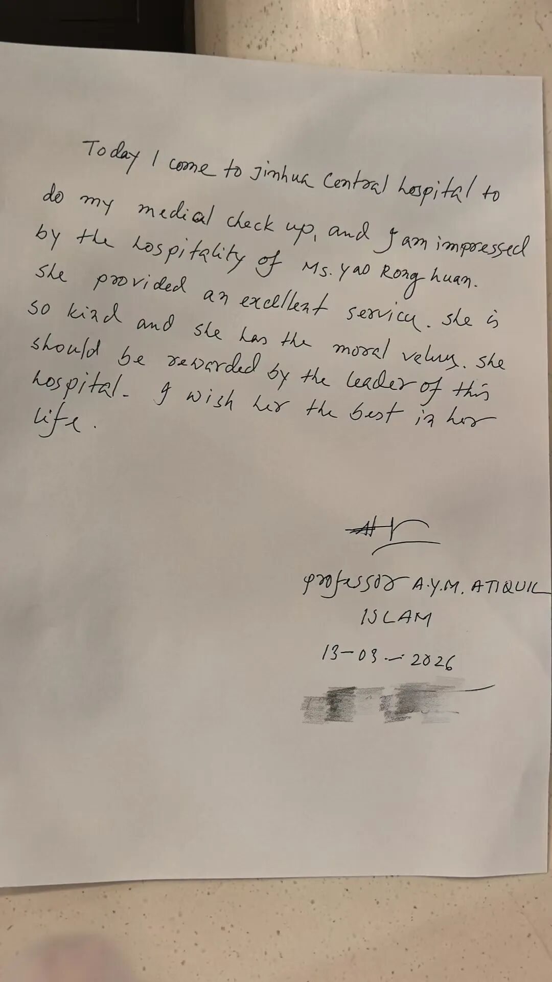 在肿瘤内科病区和健康管理中心,还收到了来自国际友人的手写感谢信和留言。语言虽有不同,但对专业服务和人文关怀的感知是相通的。一笔一画写下的感谢,是金医护理走向国际化人文服务的最好见证。