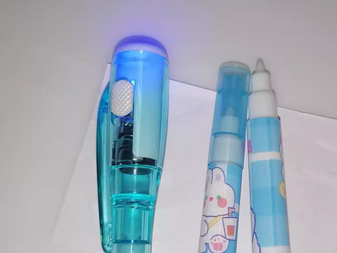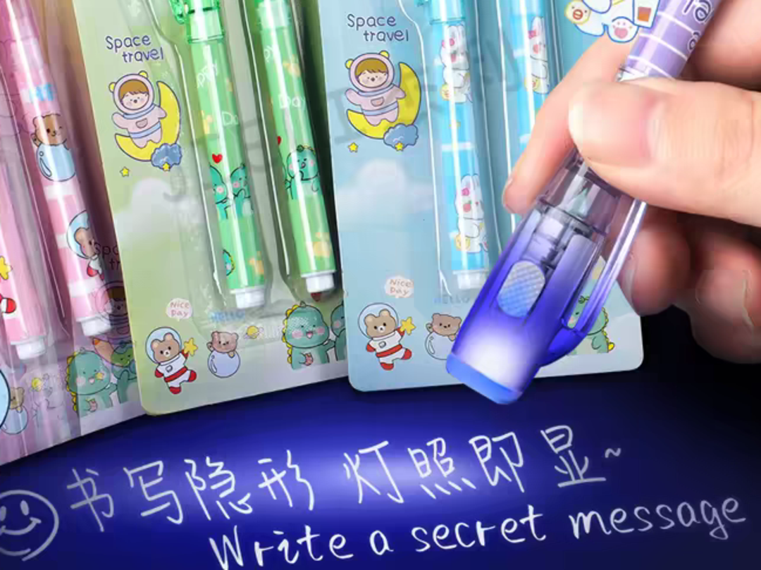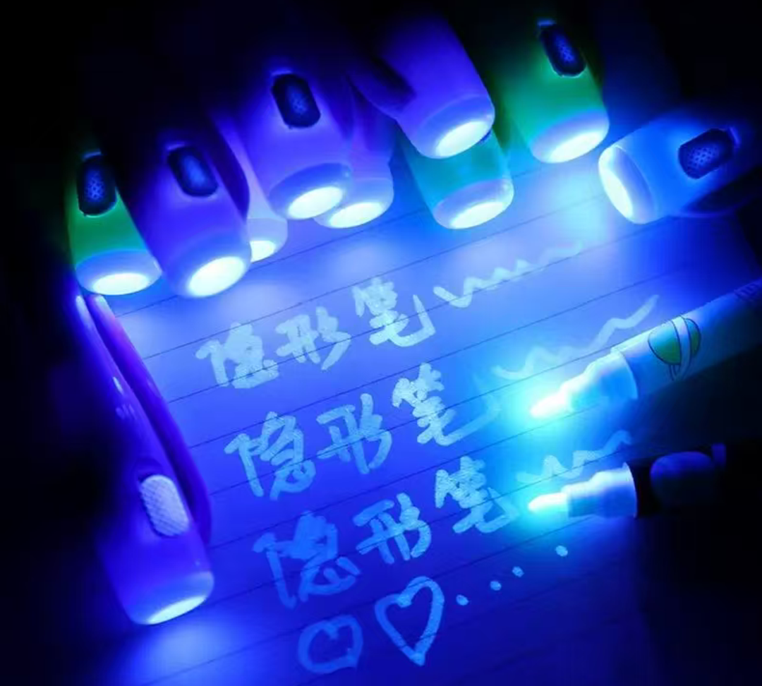 这种笔外观和普通水笔没什么区别,笔帽却比一般笔粗了一圈,上面嵌着一个小灯泡和一个按钮。笔里的墨水是透明的,写在纸上什么也看不见。但只要按下笔帽上的按钮,灯泡射出紫光,刚才写过的字就会清清楚楚地显现出来。
