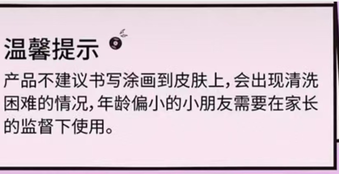 在部分产品的包装上,记者发现了小字提醒:油墨涂料对皮肤和衣服产生一定的腐蚀性,不得用此笔涂画在手上或衣服上……