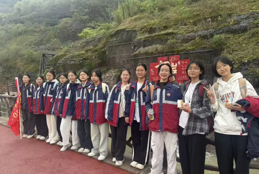告别烈士陵园,学子们前往永康方岩胡公山,开启毅行研学之旅。方岩以雄浑的丹霞地貌闻名,400米山体壁立如削,宛如擎天方柱。山脚薄雾缭绕,学子们背着行囊启程,起初步伐轻快、笑语盈盈,赞叹于自然造化的神奇。